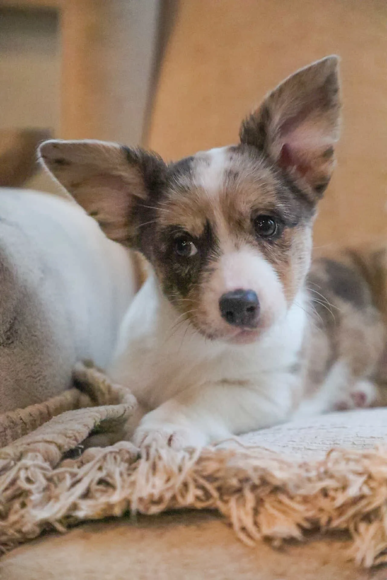 Berlyn is the newest addition to our pack here at Wigglebutts. Berlyn is a niece to our girl Ginger! She is a lovely brindle merle that is free of all genetic diseases, she also carries fluff, dilute and liver. She will eventually be paired with our boy Cruz to make some lovely American corgis.